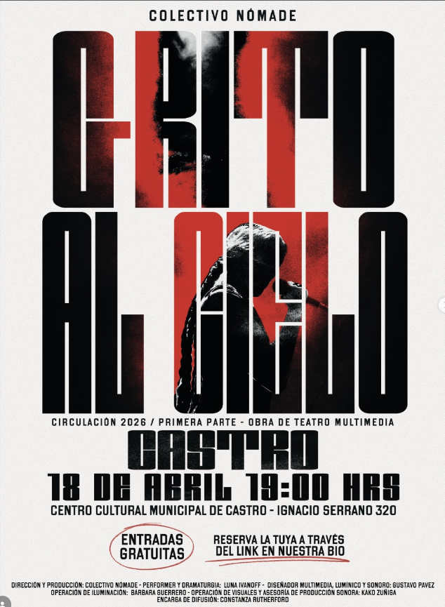Nuestra travesía por el sur continúa y la Gira FISURA llega a la Isla Grande. Nuestra obra de teatro GRITO AL CIELO se presenta en Castro para seguir habitando la grieta de lo no dicho. Una creación original de Colectivo Nómade que indaga, desde la autoficción, en la ausencia y lo no dicho en la relación entre un padre y una hija. La obra se configura como una conversación performática donde la intérprete encarna simultáneamente a ambos personajes, transitando por la herida y la posibilidad de despedida.